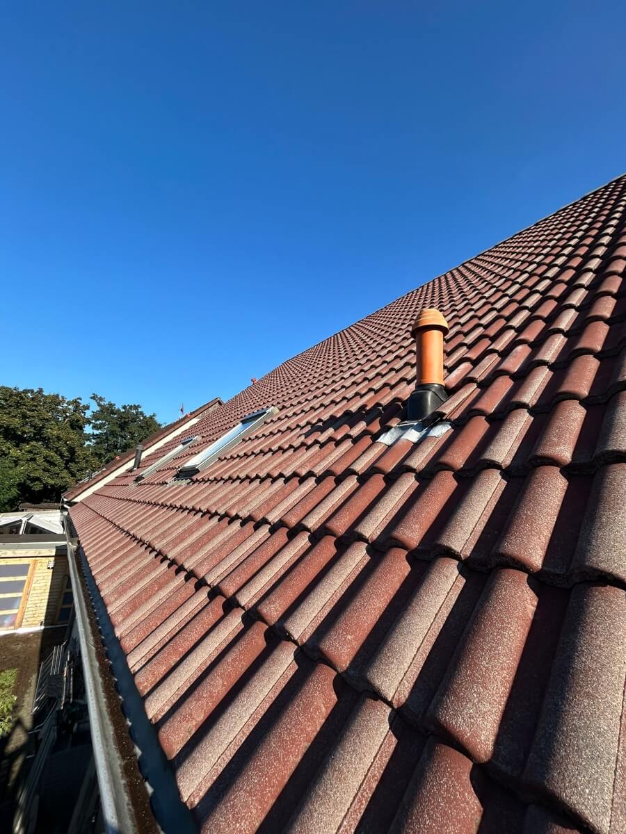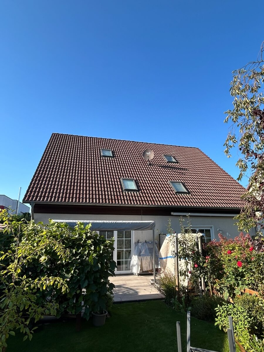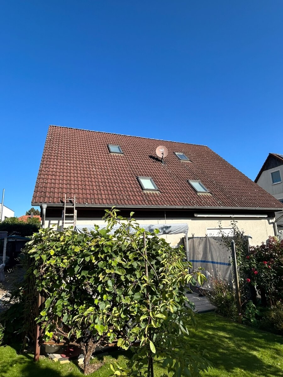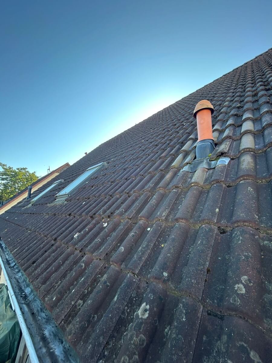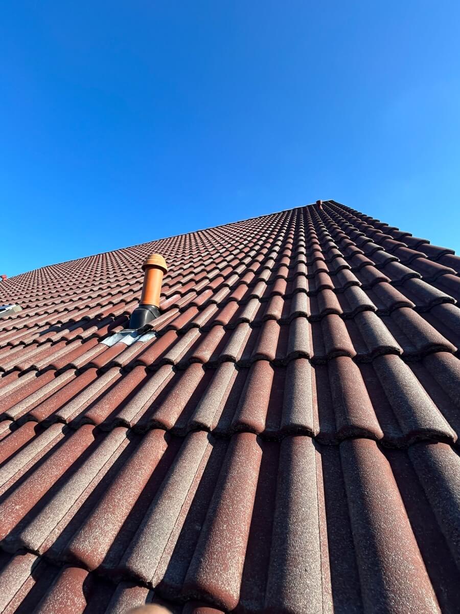 Na zlecenie właścicieli domu jednorodzinnego przy Brielower Landstraße w Brandenburgii przeprowadziliśmy kompleksowe czyszczenie dachu z dachówki betonowej. Po latach eksploatacji powierzchnia była silnie zabrudzona, pokryta mchem, glonami i nalotem, co psuło wygląd całej posesji i mogło przyspieszać degradację dachówek.