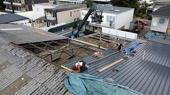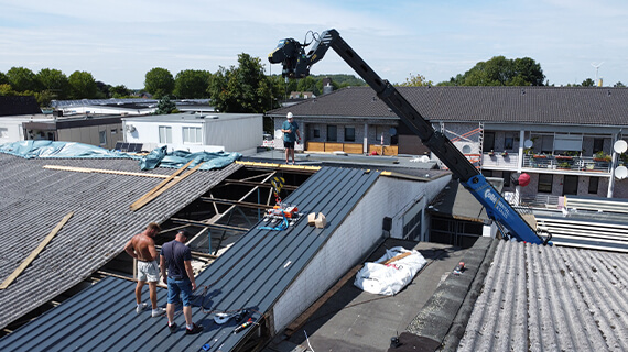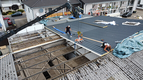 W Übach-Palenberg (Niemcy) przeprowadziliśmy kompletną renowację dachu. Stare pokrycie z płyt azbestowo-cementowych zostało fachowo zdemontowane i zastąpione nowoczesnym dachem z płyt warstwowych PIR o grubości 12 cm. Nasze prace obejmowały: