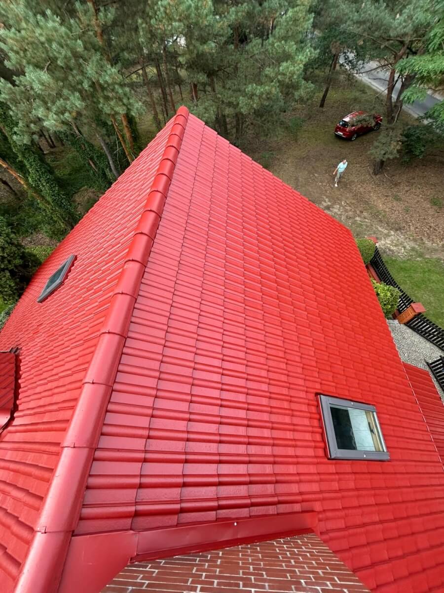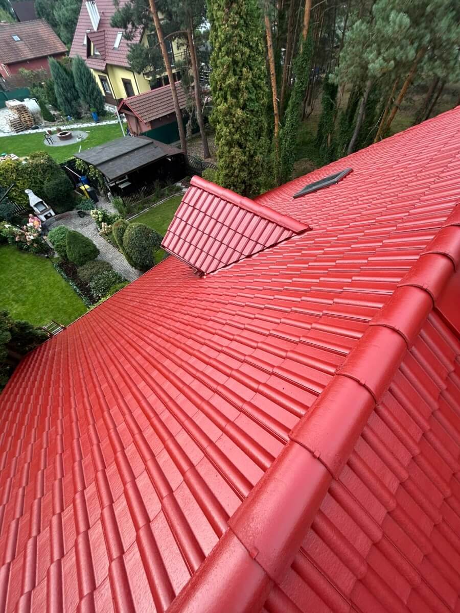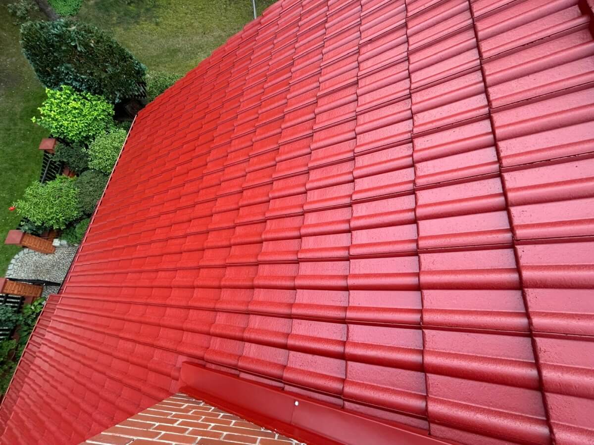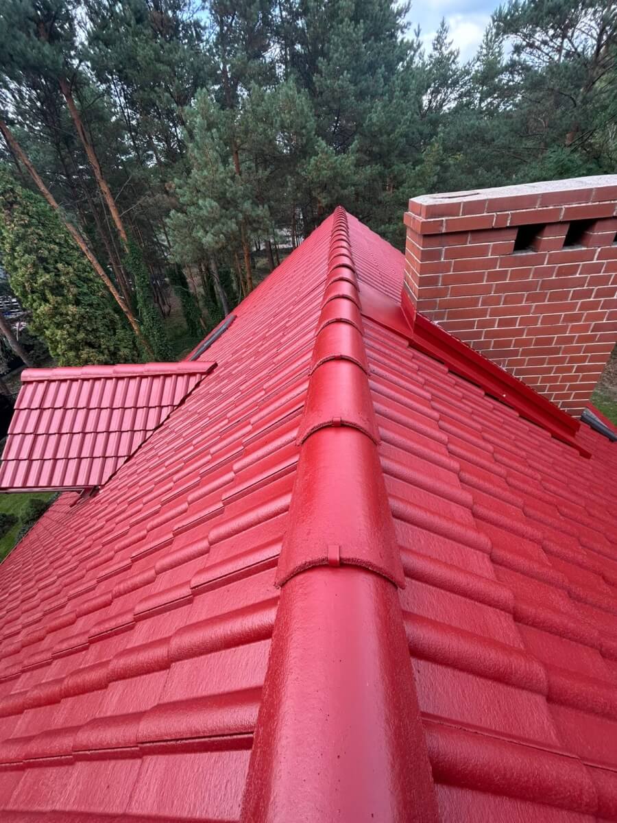 - nałożyliśmy warstwę podkładową, a następnie dwie warstwy specjalistycznej farby dachowej w soczystym, czerwonym kolorze.