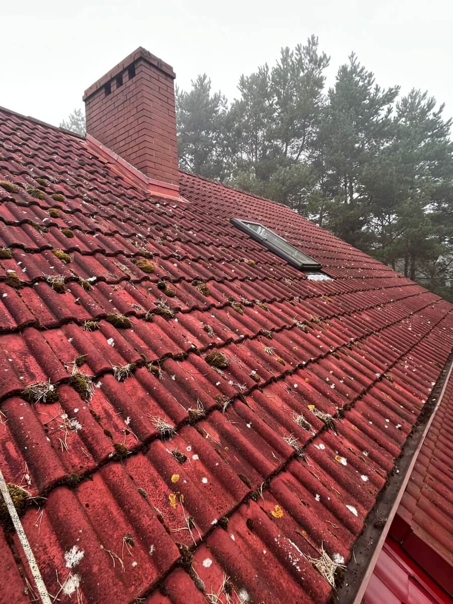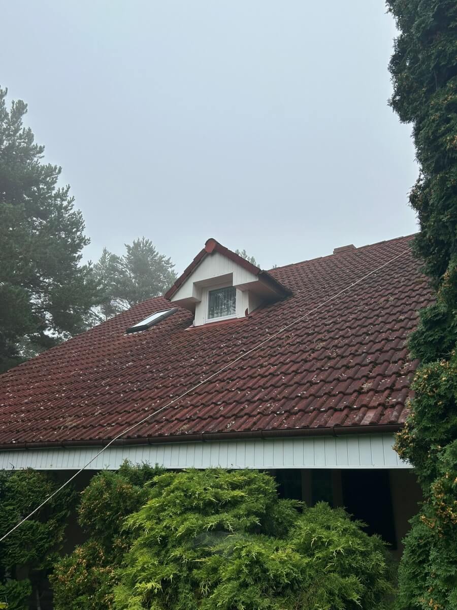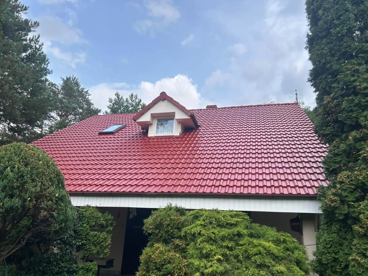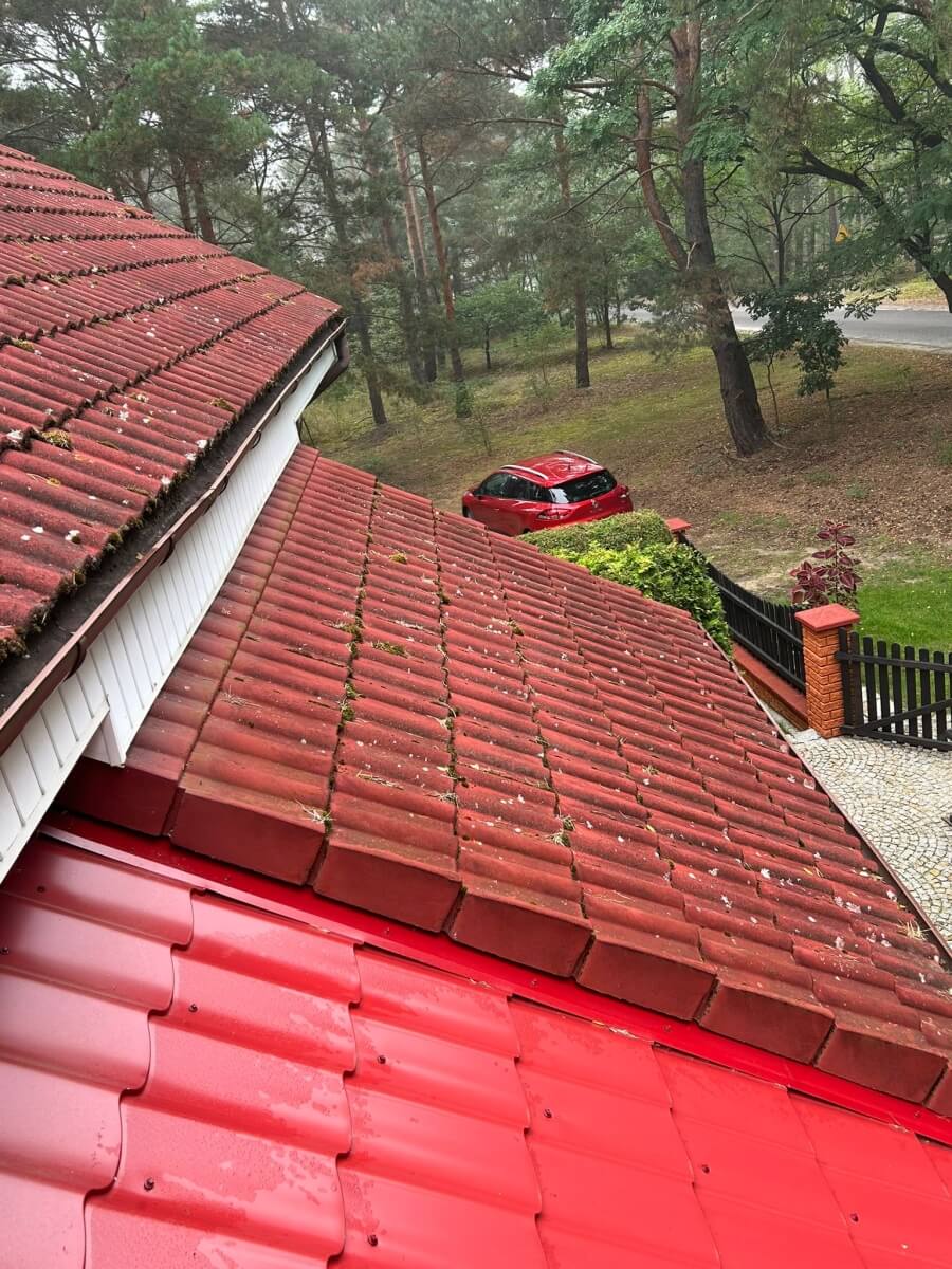 W miejscowości Jeziorna pod Nową Solą odmieniliśmy dach pięknego domu położonego wśród drzew. Dachówka była pokryta mchem, igliwiem i nalotem – kolor stał się matowy i wypłowiały. Właściciele chcieli znów cieszyć się intensywną czerwienią dachu pasującą do zadbanego ogrodu.