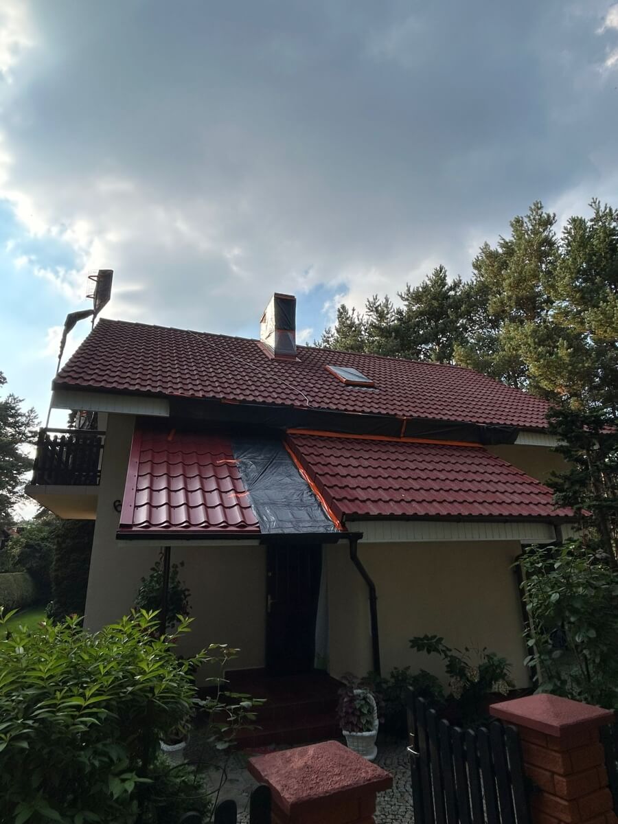 - zabezpieczyliśmy komin, okna dachowe, elewację i rynny folią oraz taśmą,