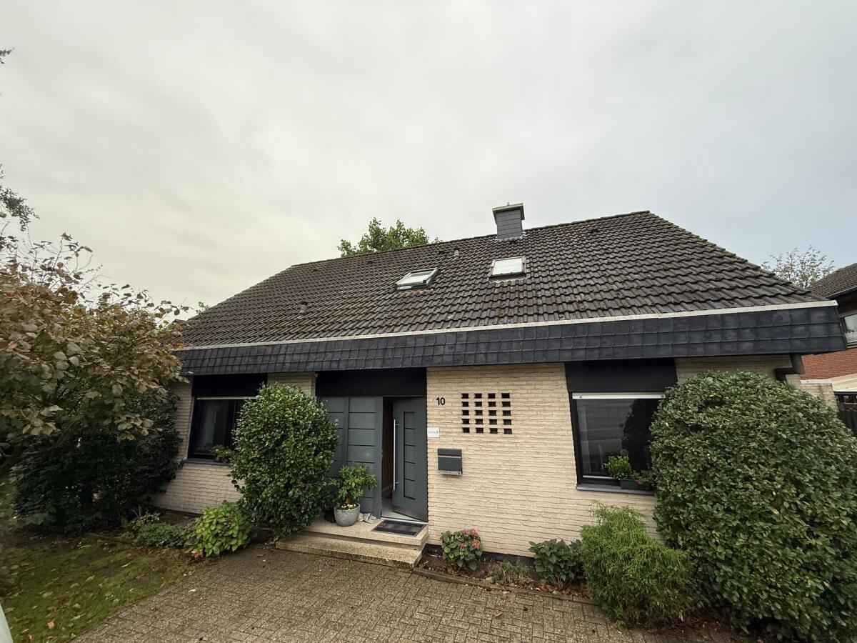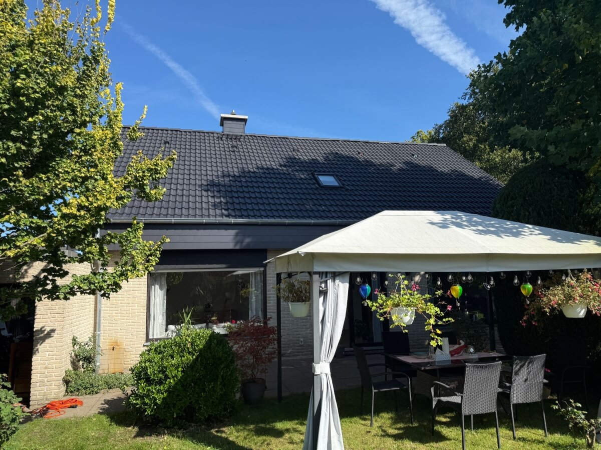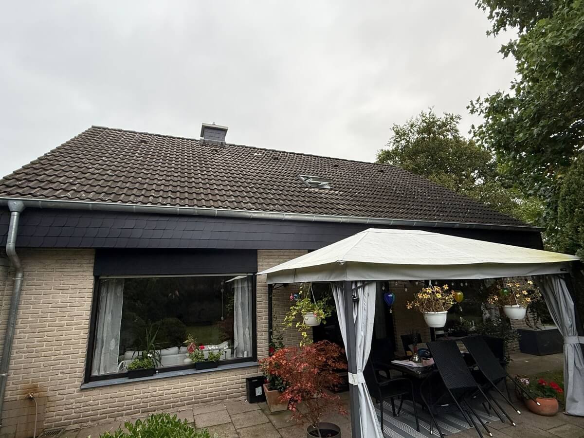 Na tym budynku wykonaliśmy kompleksową renowację dachu: dokładne mycie dachówki oraz malowanie w kolorze antracyt. Dach był wcześniej mocno zabrudzony, z licznymi porostami i przebarwieniami, przez co cały dom wyglądał na starszy, niż był w rzeczywistości.