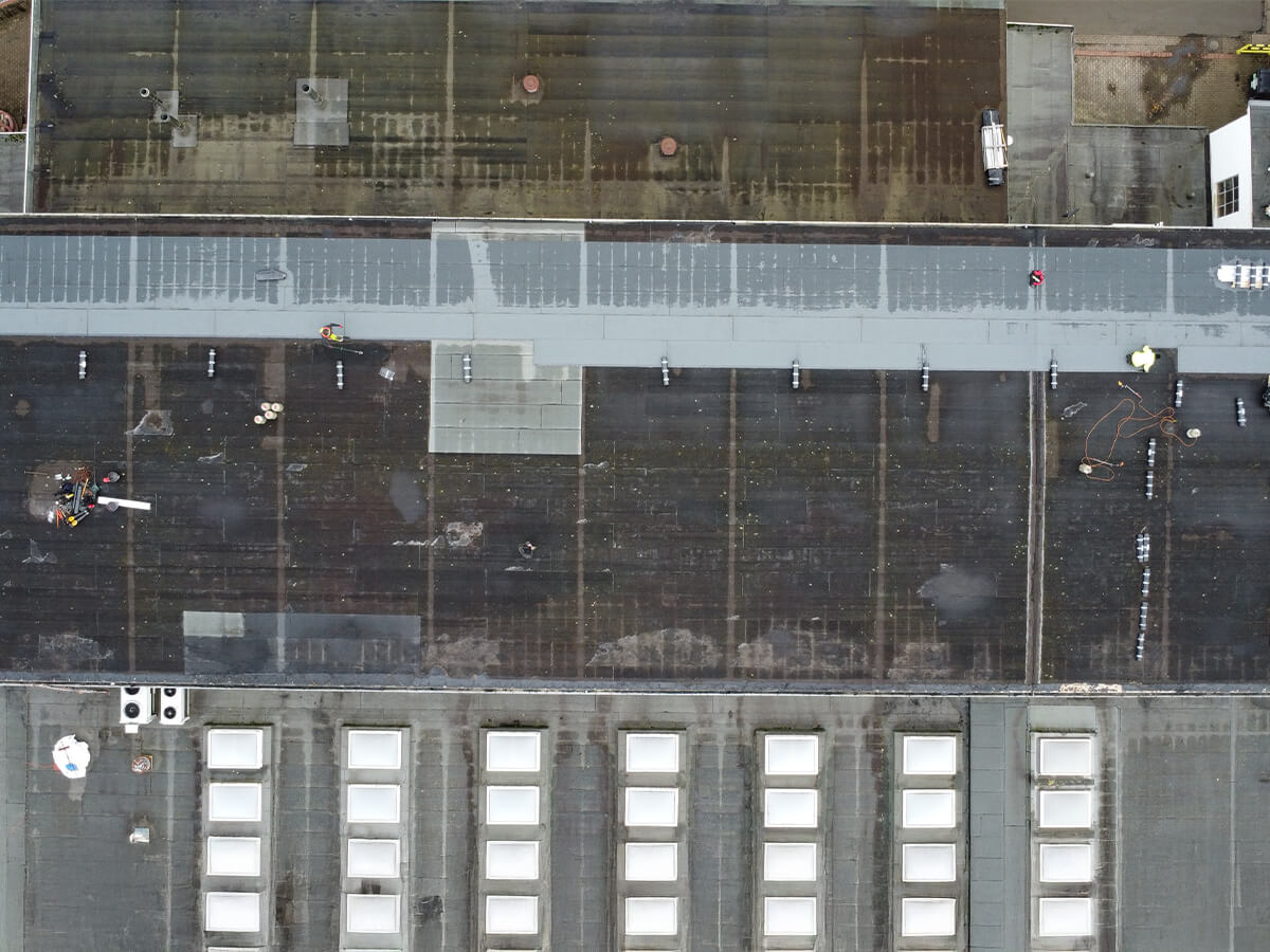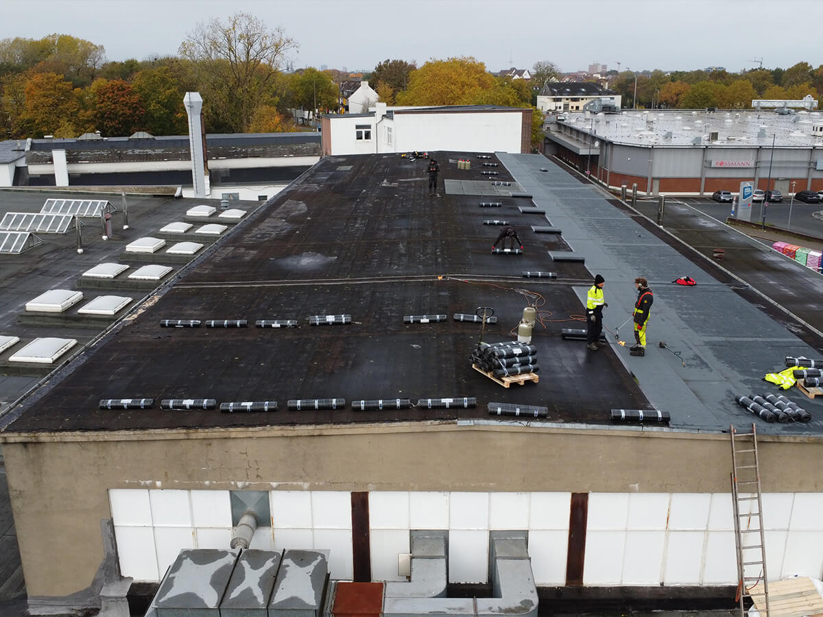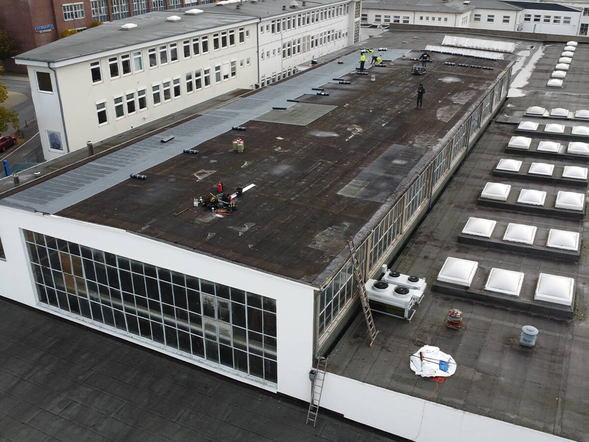 U naszych klientów w Bremie przeprowadziliśmy kompleksową renowację cieknącego dachu płaskiego hali produkcyjnej. Po wizji lokalnej przygotowaliśmy harmonogram i kosztorys, a po akceptacji przystąpiliśmy do prac: oczyściliśmy podłoże, zabezpieczyliśmy i naprawiliśmy uszkodzenia starej powłoki, a następnie na całej powierzchni ok. 1000 m² zainstalowaliśmy nową, zgrzewaną powłokę hydroizolacyjną o grubości 5,3 mm z dopracowaniem zakładów, krawędzi i przejść instalacyjnych. Dla trwałego odwodnienia wymieniliśmy 108 mb rynien na tytanowo-cynkowe oraz zamontowaliśmy 108 mb pasów nadrynnowych i 58 mb wiatrownic.